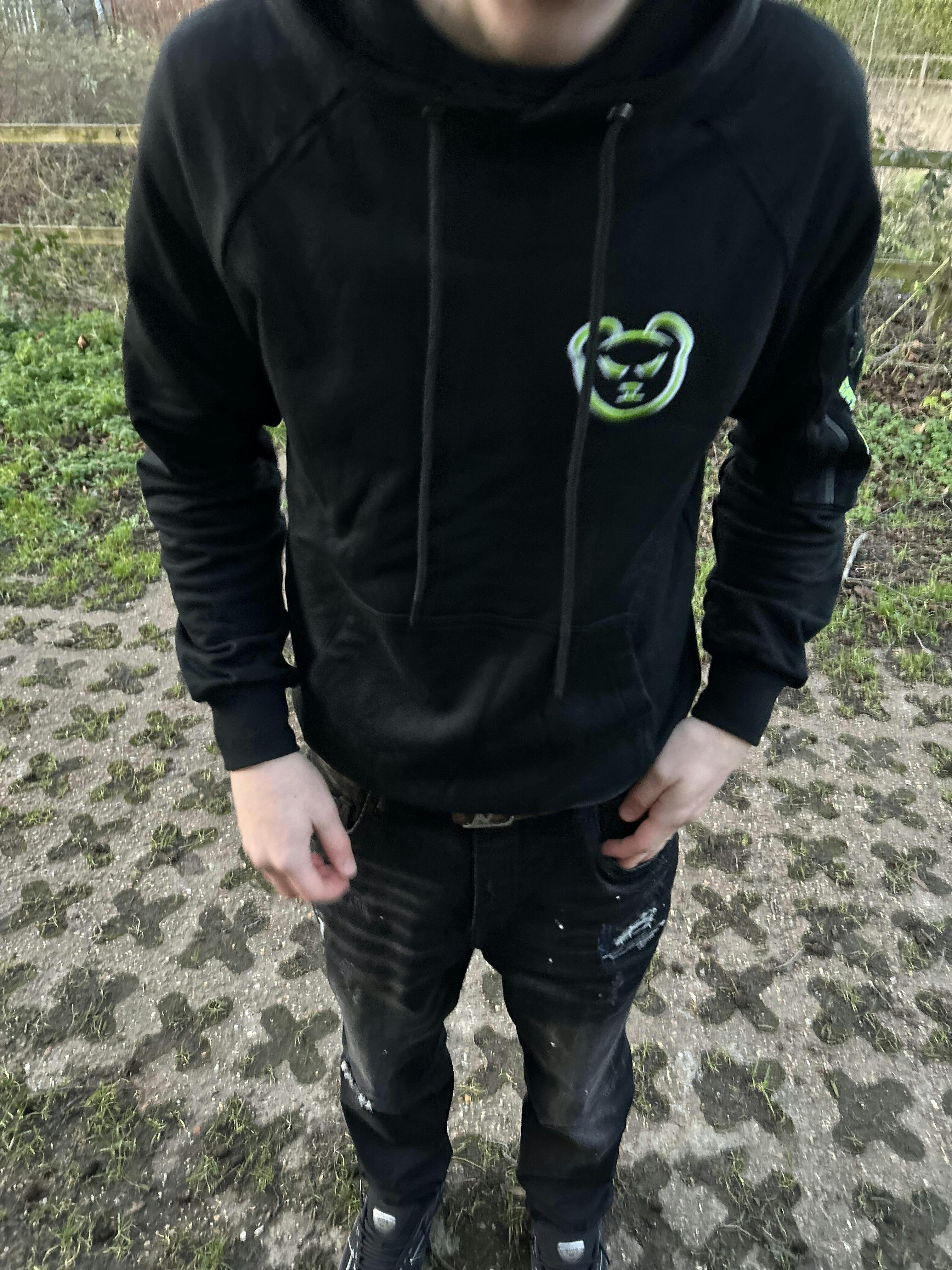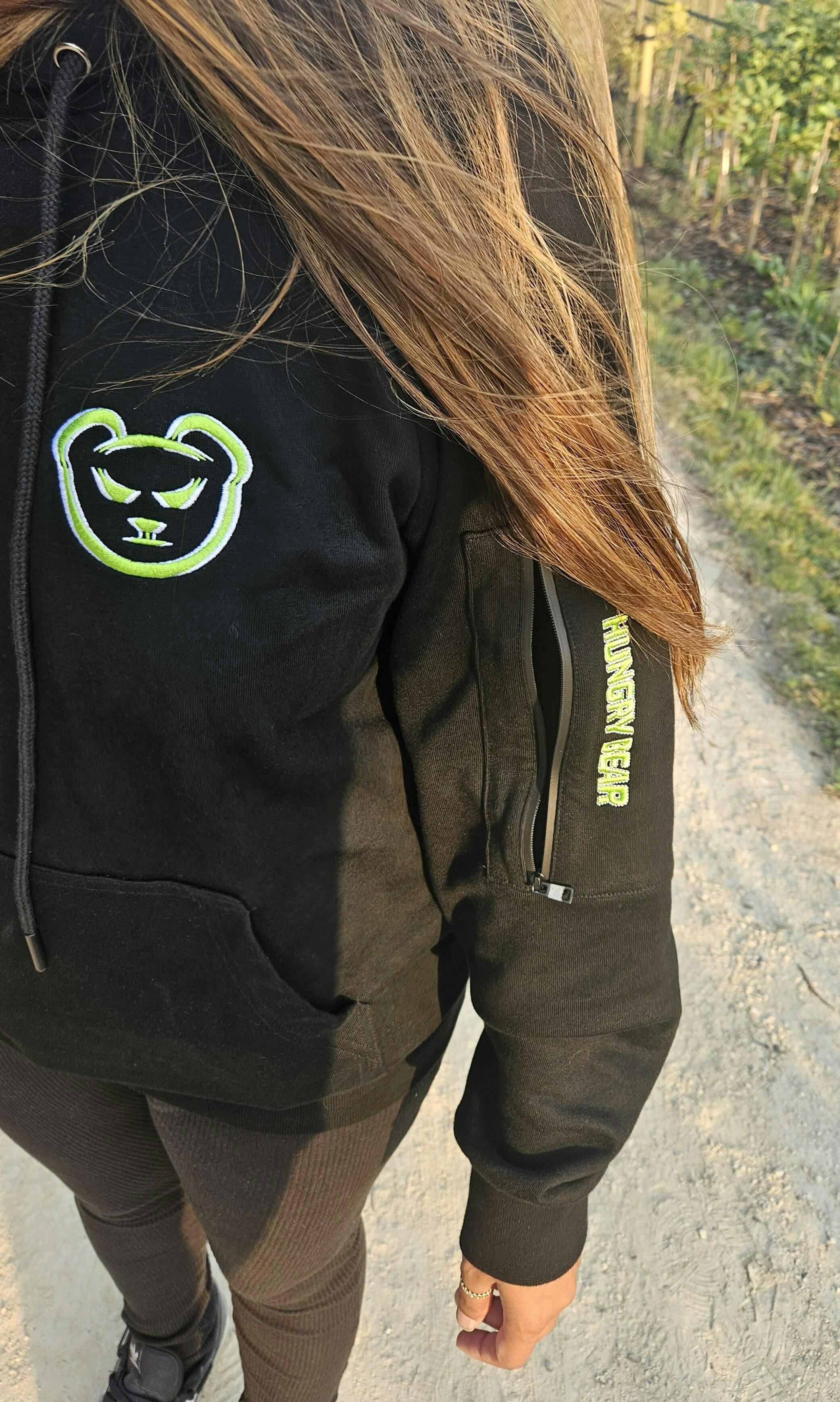 Dare to stand out with our BLACK COTTON HOODIE, equipped with a custom arm pocket , Made with 100% cotton and weighing 430gsm, embroidered logos and a bold neon green/black colour combo make for a fierce and eye-catching look. Don't just blend in - embrace the challenge and stand out from the pack!
